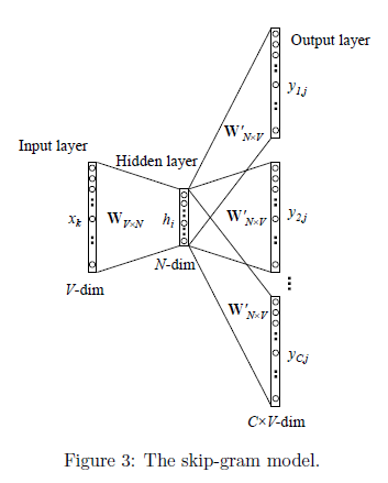 Skip-Gram 是给定 input word 来预测上下文,其模型结构如上图所示。它的做法是,将一个词所在的上下文中的词作为输出,而那个词本身作为输入,也就是说,给出一个词,希望预测可能出现的上下文的词。通过在一个大的语料库训练,得到一个从输入层到隐含层的权重模型