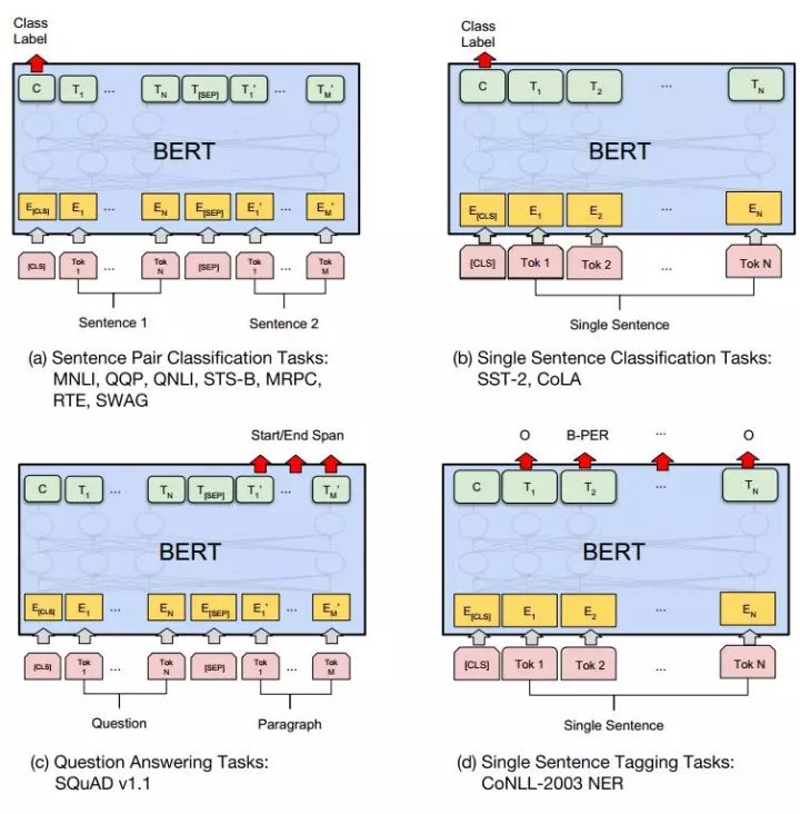 下图展示了 BERT 在 11 个不同任务中的模型,它们只需要在 BERT 的基础上再添加一个输出层便可以完成对特定任务的微调。这些任务类似于我们做过的文科试卷,其中有选择题,简答题等等。图 3 中其中 Tok 表示不同的 Token,E 表示嵌入向量,\(T_i\) 表示第 i 个 Token 在经过 BERT 处理之后得到的特征向量。