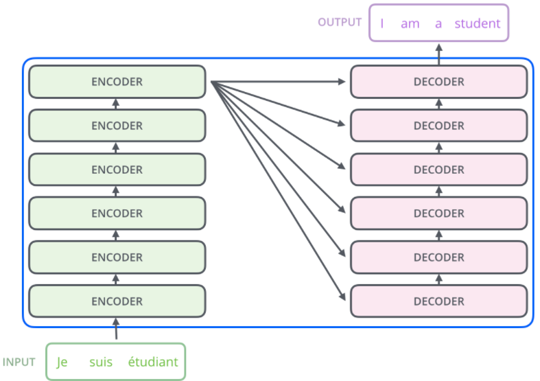 编码部分和解码部分都为编码器、解码器的堆叠,最后一层编码器的输出是各个解码器的输入之一。第一个编码器的输入为单词的嵌入向量,后面编码器输入为前一层的输出。