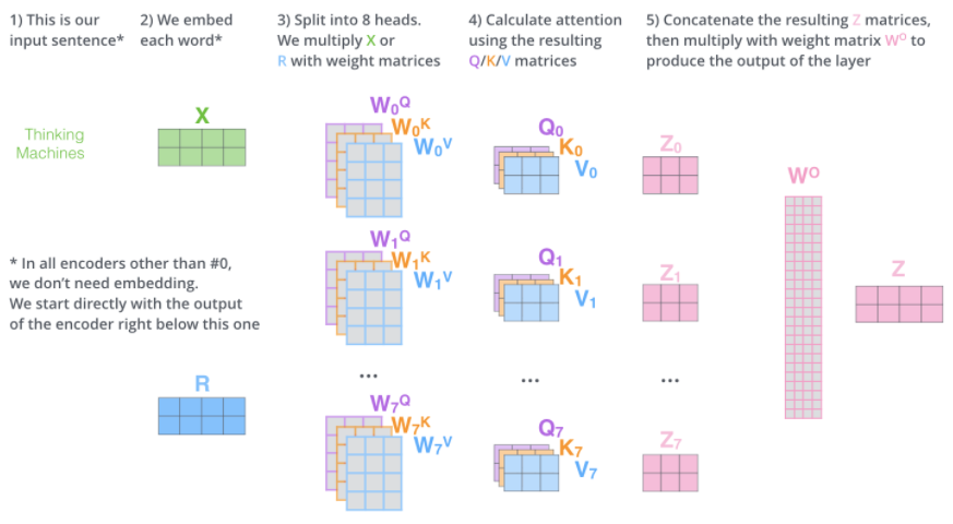 进一步优化 Self-attention:使用 multi-headed attention。提高了模型关注不同位置的能力,为注意力层提供了多个表示子空间(representation subspaces)—— 可以有多组 Query、Key、Value 权重矩阵,每一组都是随机初始化,因此训练完成后每一组都可以将输入投射到不同的子空间,具体可以类比 CNN 中的多个卷积核。