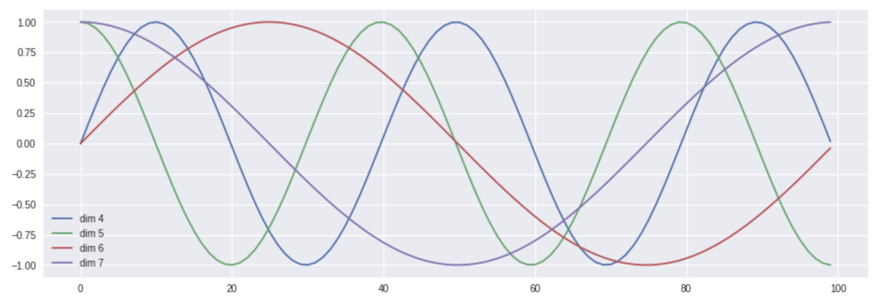 上面表达式中的 \(pos\) 代表词的位置,\(d_{model}\) 代表位置向量的维度,\(i \in [0, d_{model})\) 代表位置 \(d_{model}\) 维位置向量第 \(i\) 维。于是根据上述公式,我们可以得到第 \(pos\) 位置的 \(d_{model}\) 维位置向量。在下图中,我们画出了一种位置向量在第4、5、6、7维度、不同位置的的数值大小。横坐标表示位置下标,纵坐标表示数值大小。