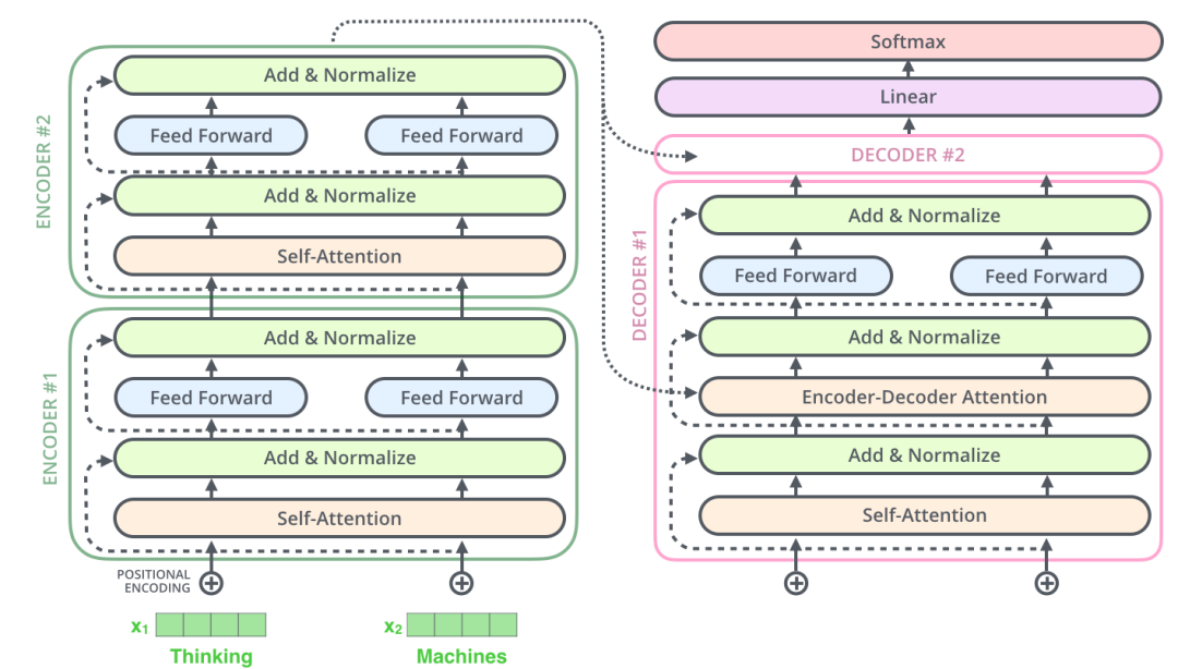 编码器和和解码器的子层里面都有层标准化(layer-normalization)。假设一个 Transformer 是由 2 层编码器和两层解码器组成的,将全部内部细节展示起来如下图所示。