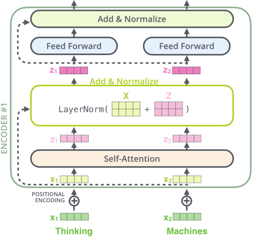 将 Self-Attention 层的层标准化(layer-normalization)和涉及的向量计算细节都进行可视化,如下所示:
